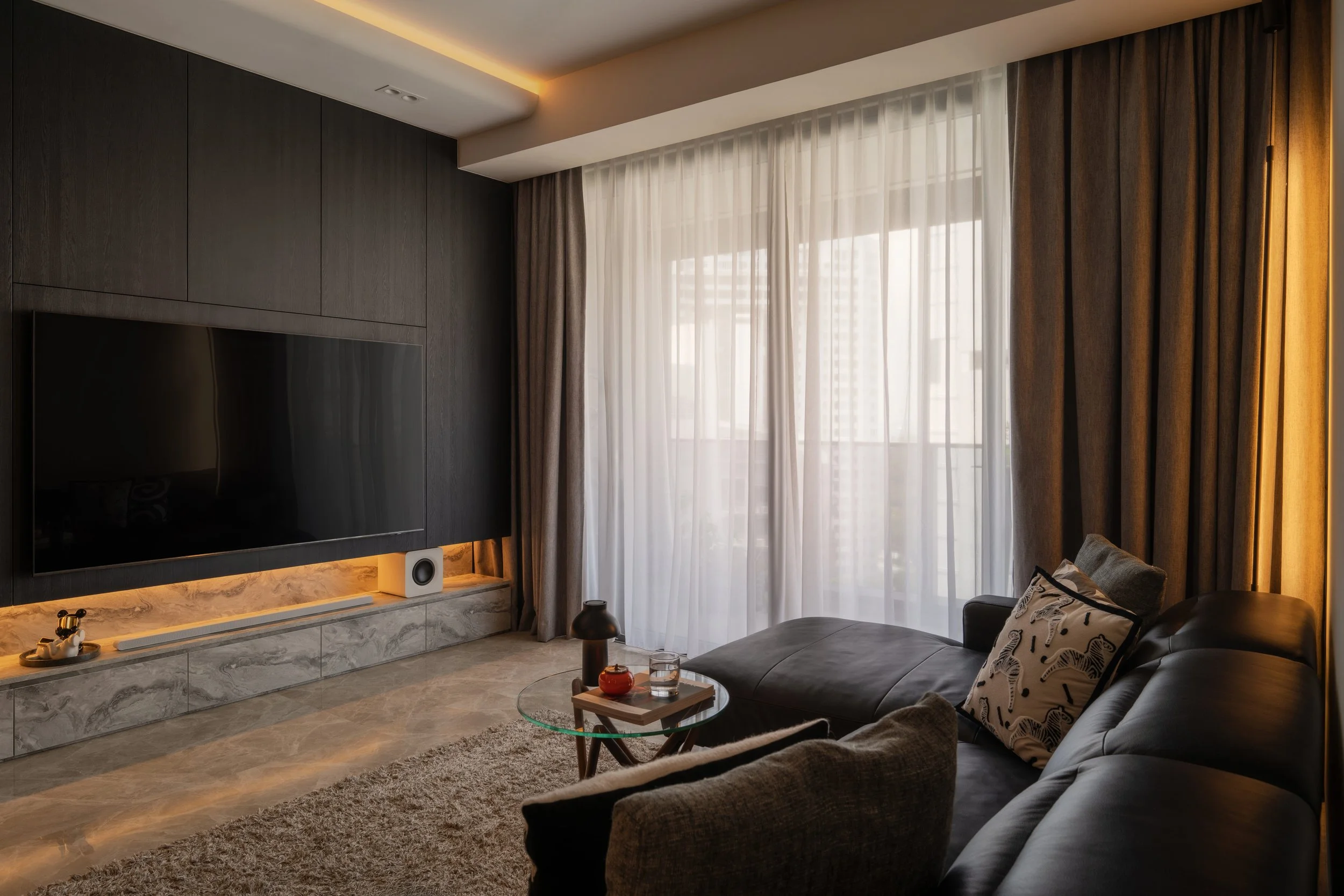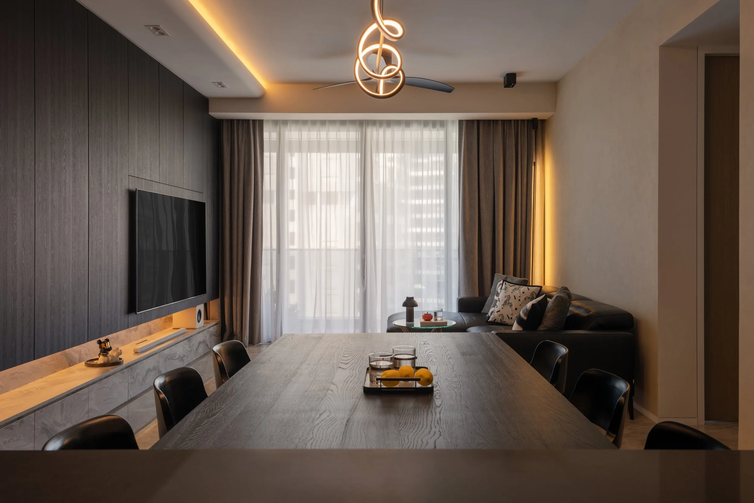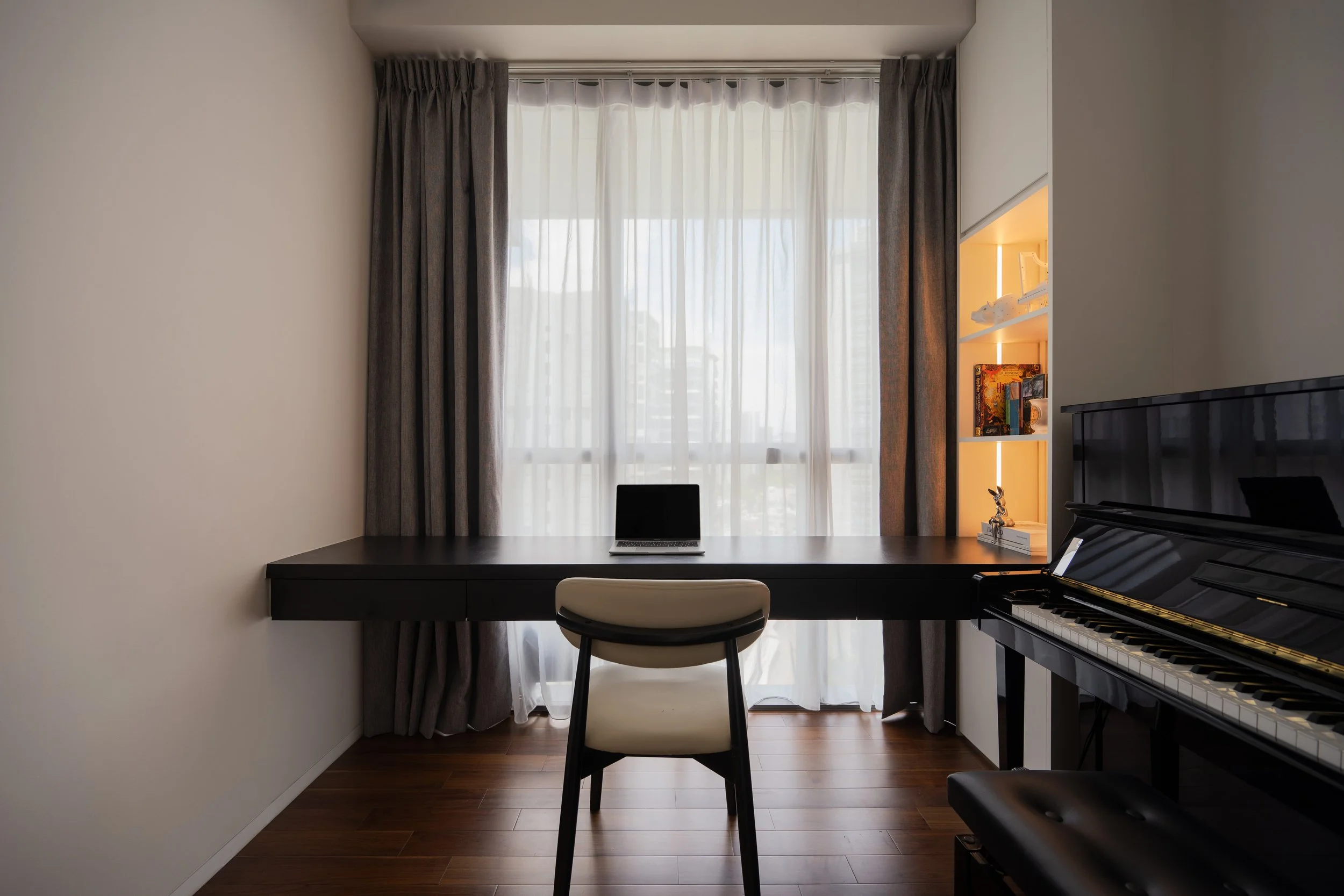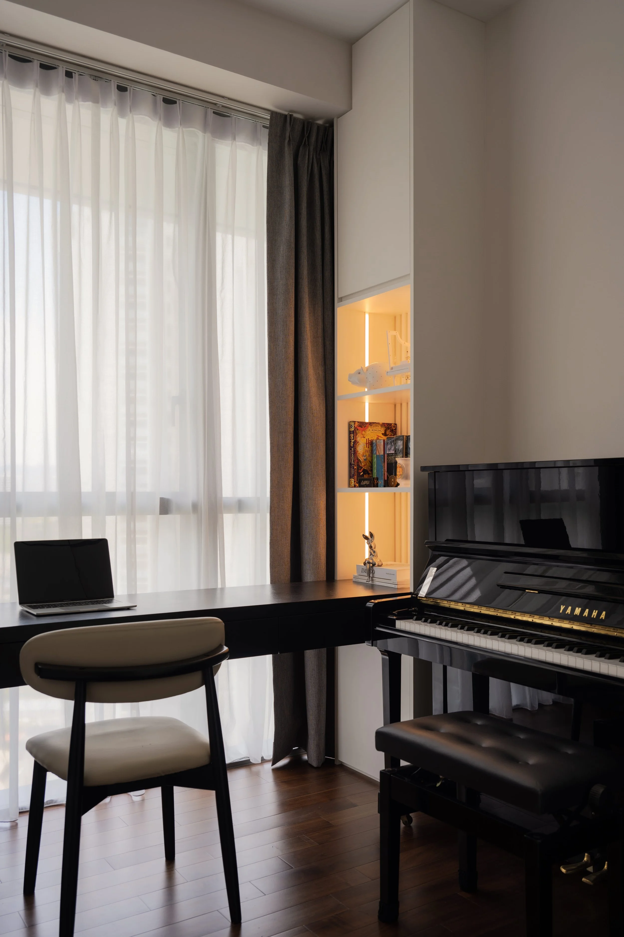 This residence is a masterclass in harmonising contrasts. Expansive windows invite streams of natural light, softened by sheer drapery, into spaces where deep, moody tones create an intimate backdrop. In the study, a long, sleek desk shares the stage with a polished Yamaha piano, embodying both productivity and creativity. Gentle accent lighting along display shelves draws the eye to curated decorative fittings, while the living area extends this narrative with a seamless interplay of dark wood, marble, and concealed illumination.