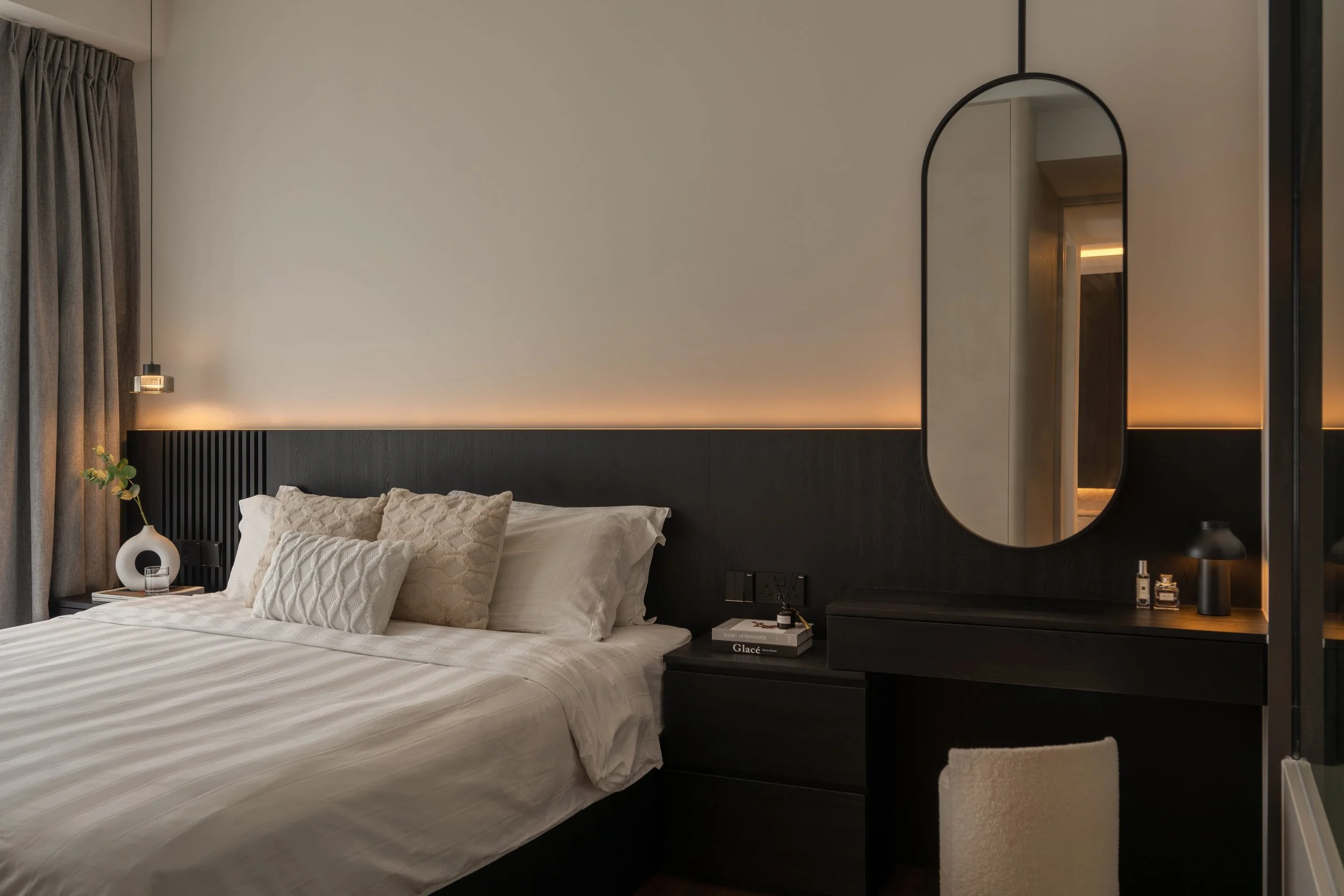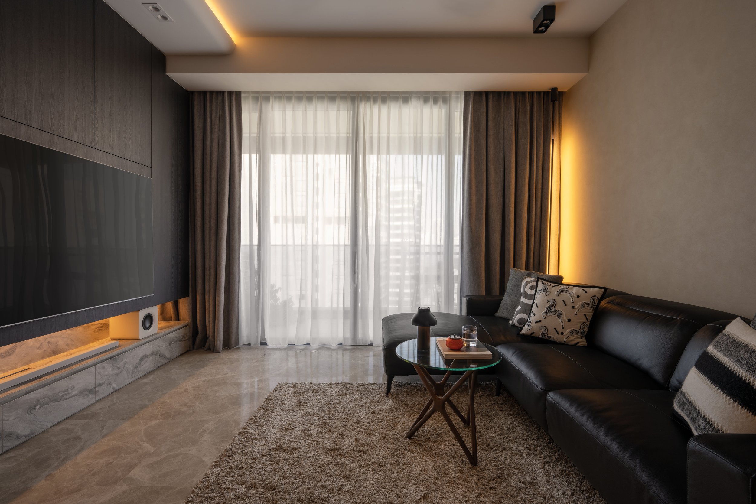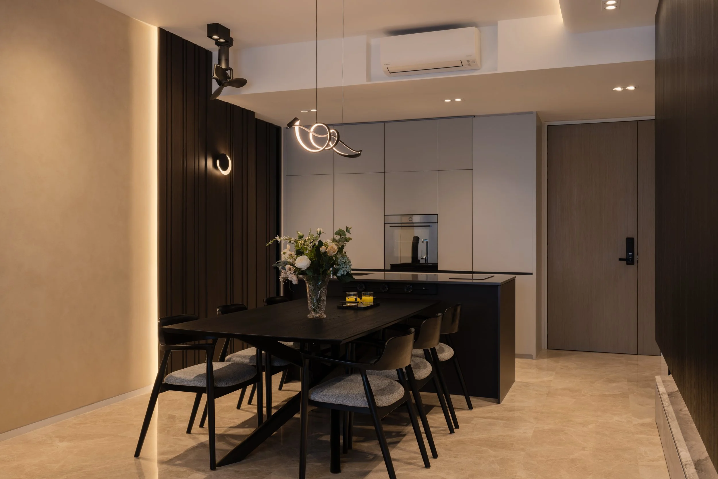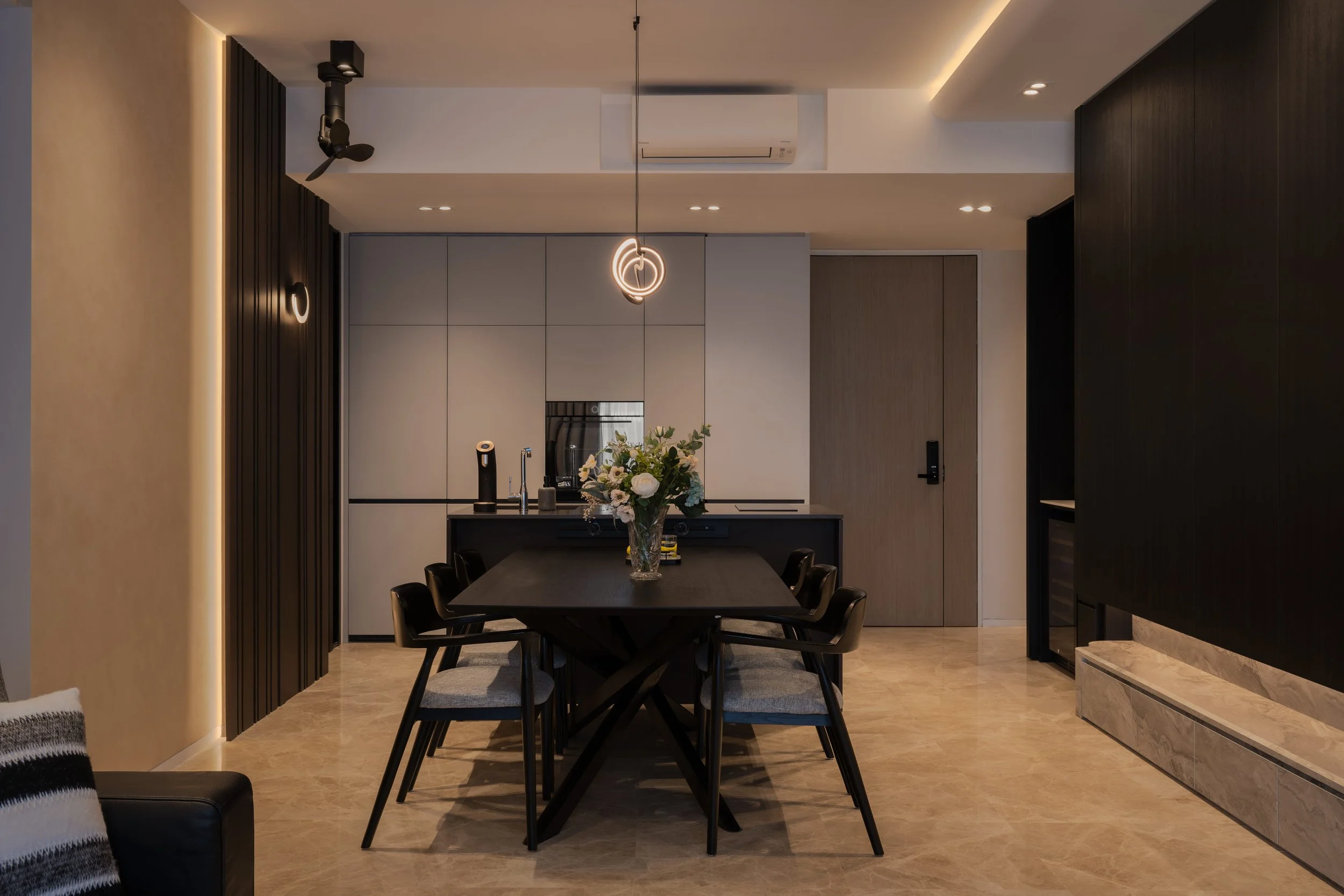 This residence is a masterclass in harmonising contrasts. Expansive windows invite streams of natural light, softened by sheer drapery, into spaces where deep, moody tones create an intimate backdrop. In the study, a long, sleek desk shares the stage with a polished Yamaha piano, embodying both productivity and creativity. Gentle accent lighting along display shelves draws the eye to curated decorative fittings, while the living area extends this narrative with a seamless interplay of dark wood, marble, and concealed illumination.