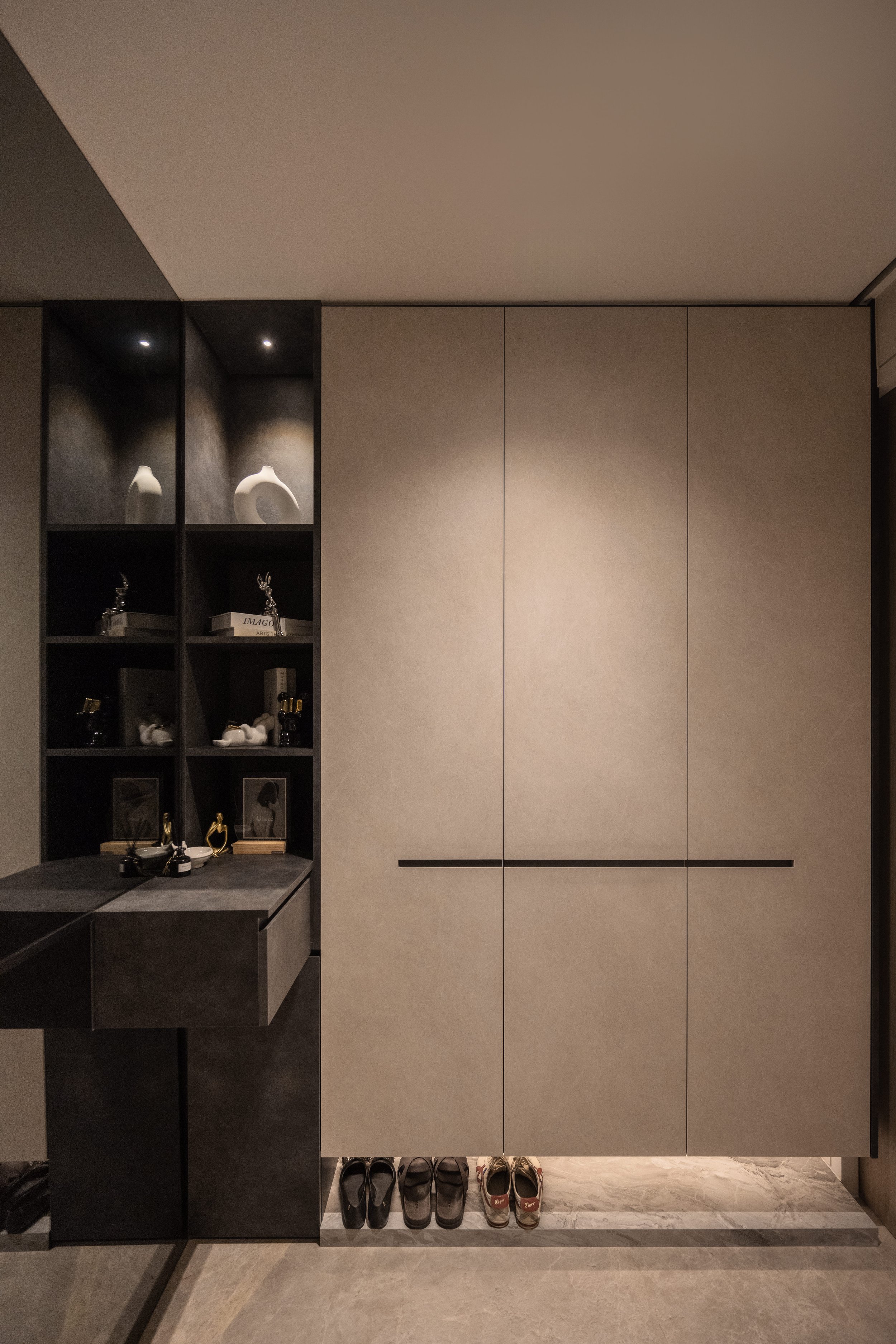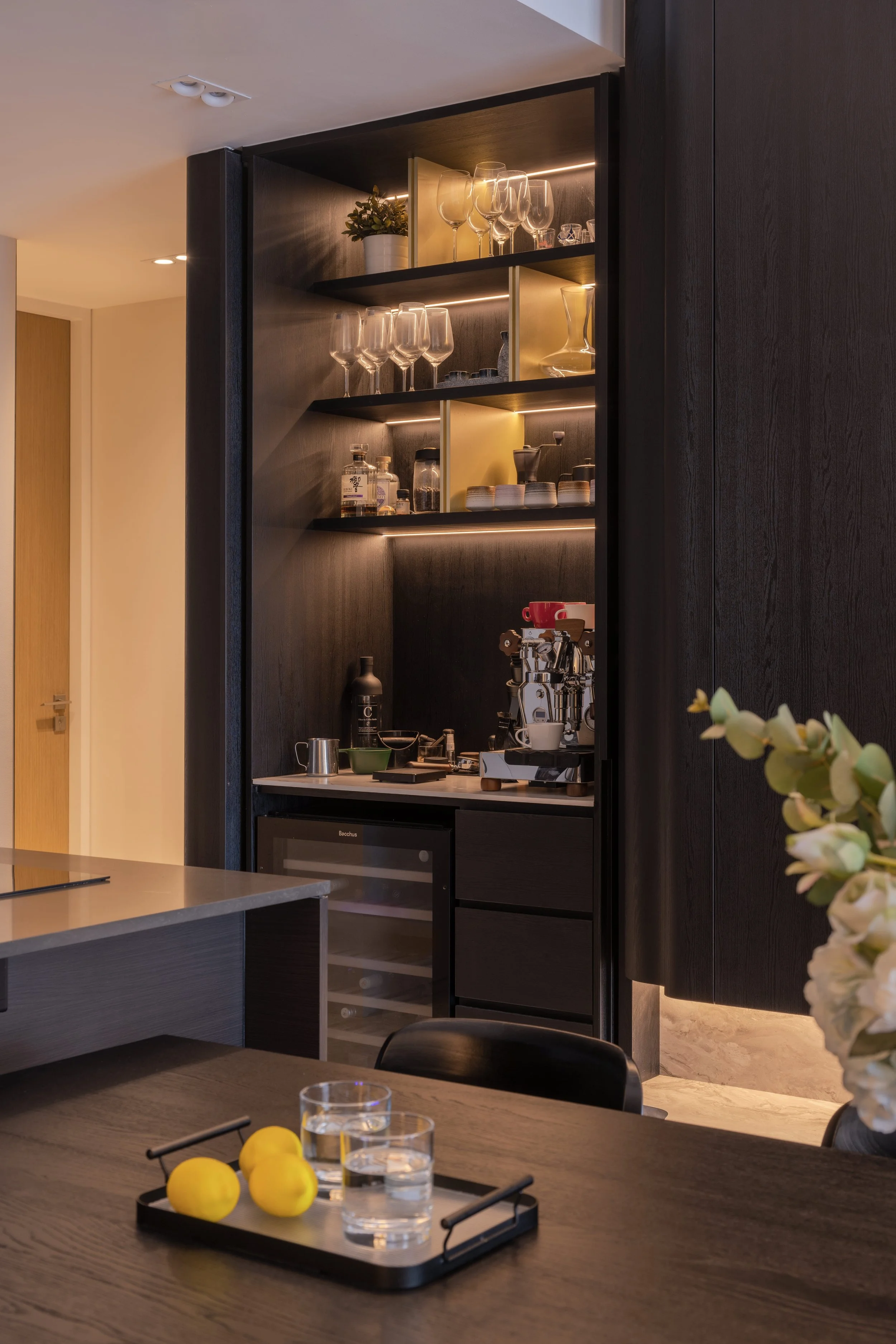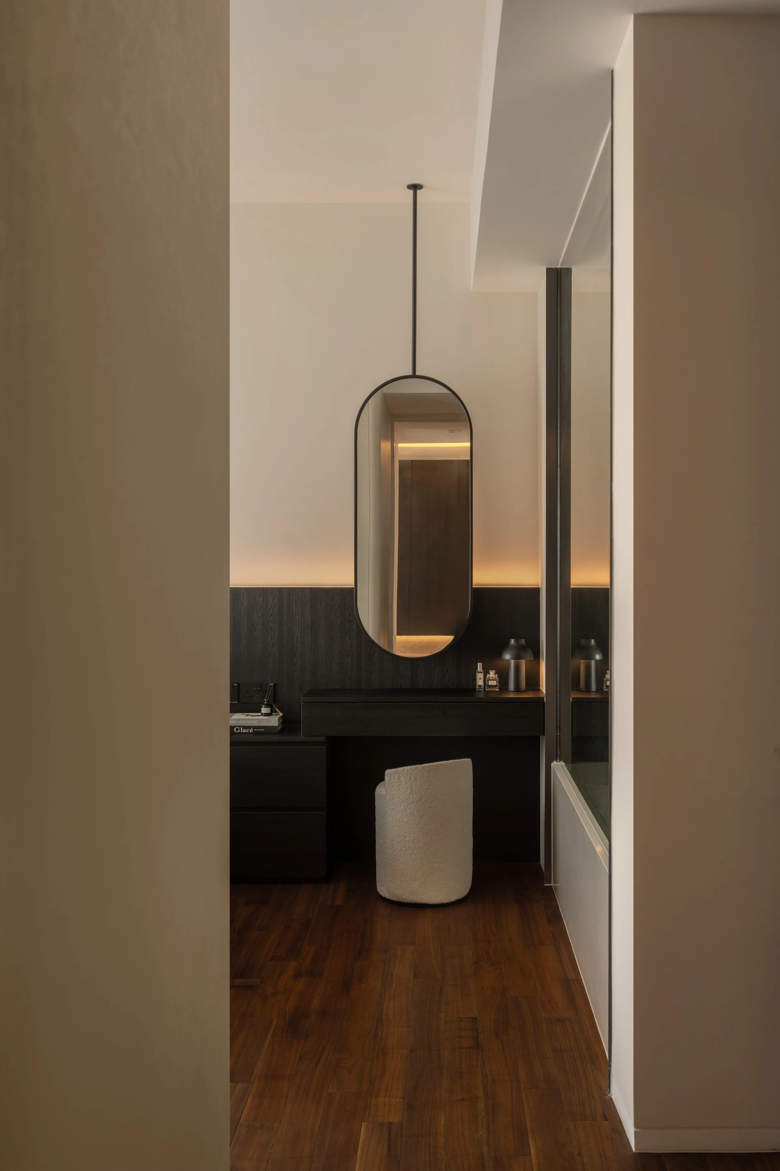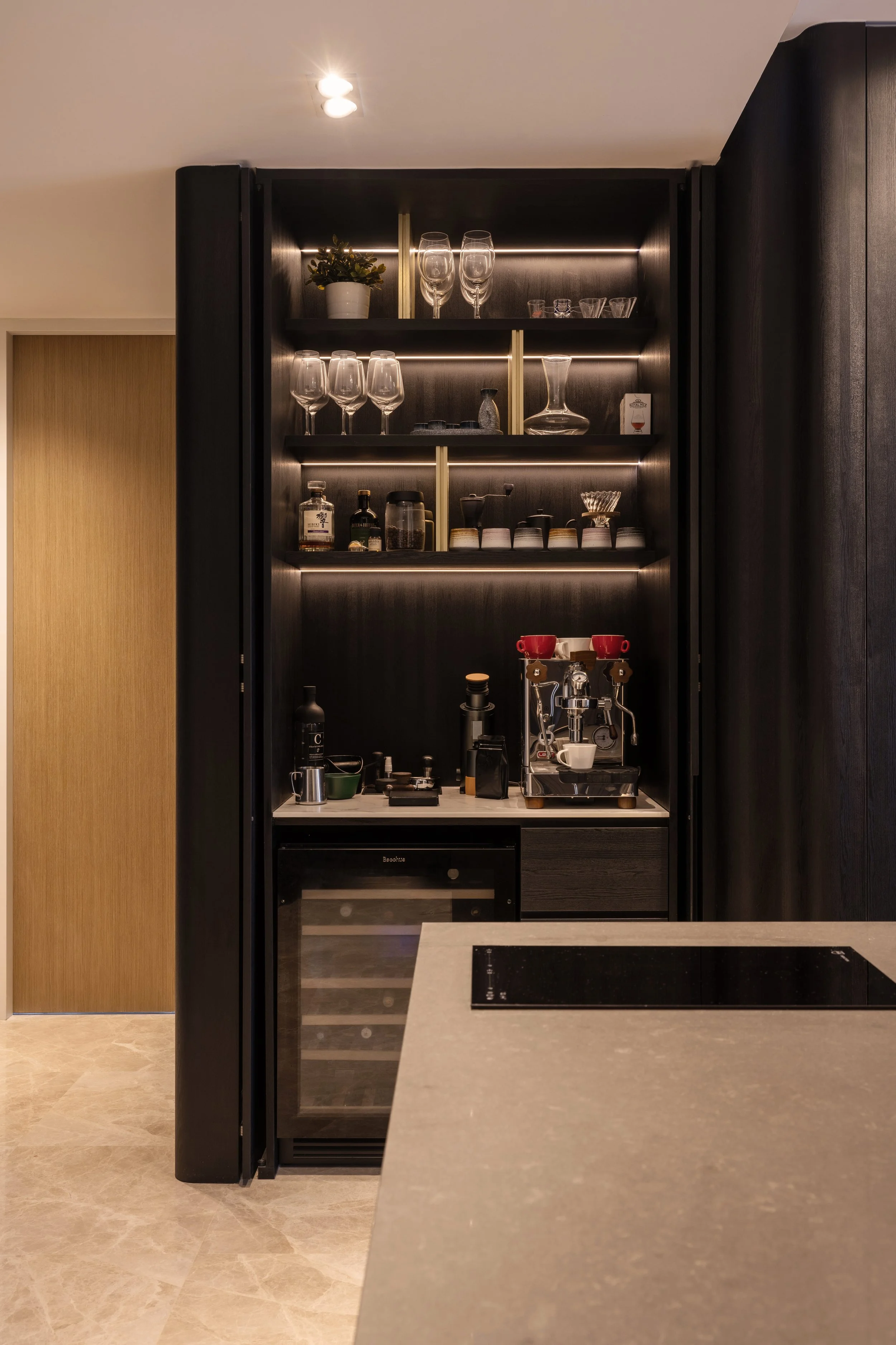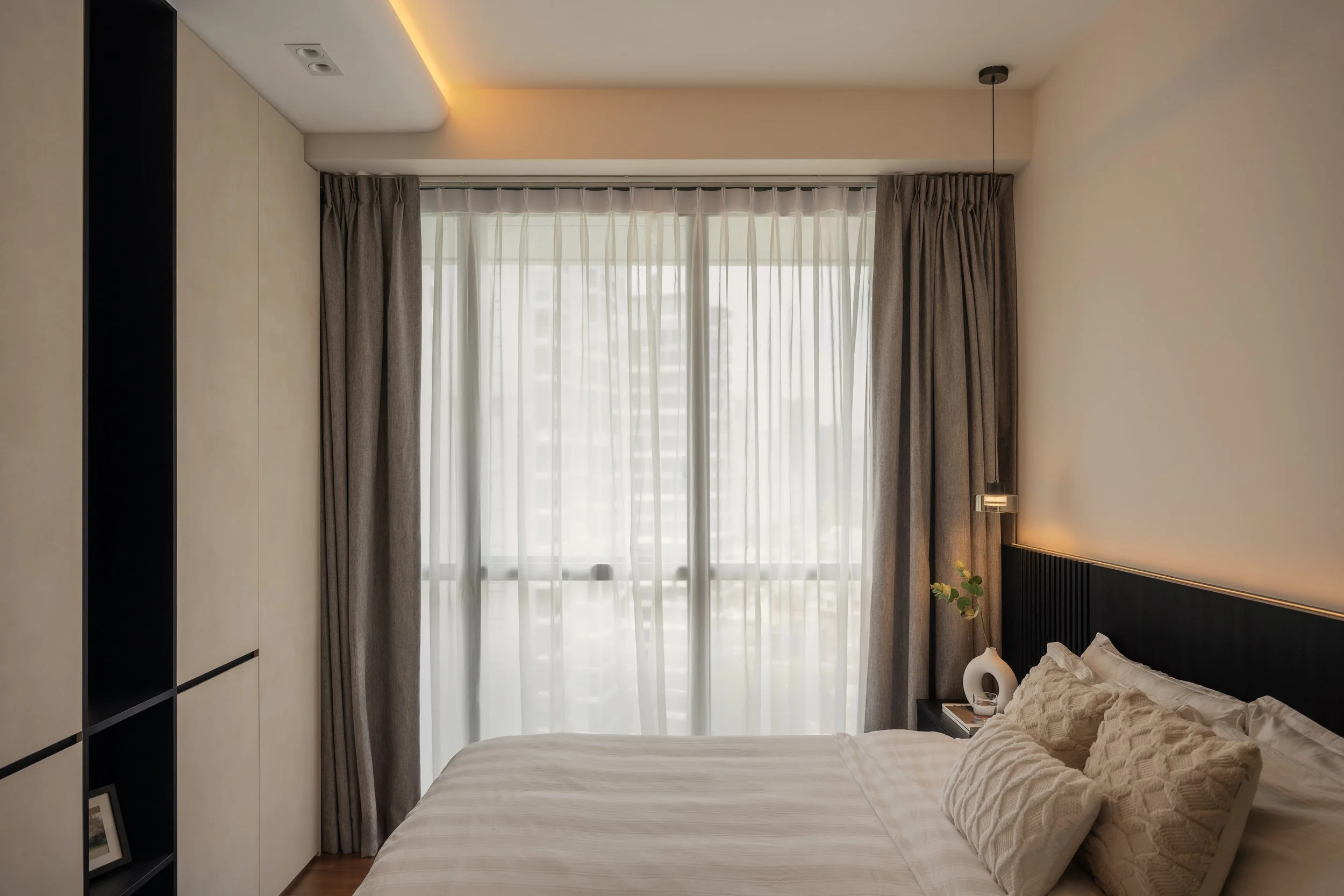 This residence is a masterclass in harmonising contrasts. Expansive windows invite streams of natural light, softened by sheer drapery, into spaces where deep, moody tones create an intimate backdrop. In the study, a long, sleek desk shares the stage with a polished Yamaha piano, embodying both productivity and creativity. Gentle accent lighting along display shelves draws the eye to curated decorative fittings, while the living area extends this narrative with a seamless interplay of dark wood, marble, and concealed illumination.