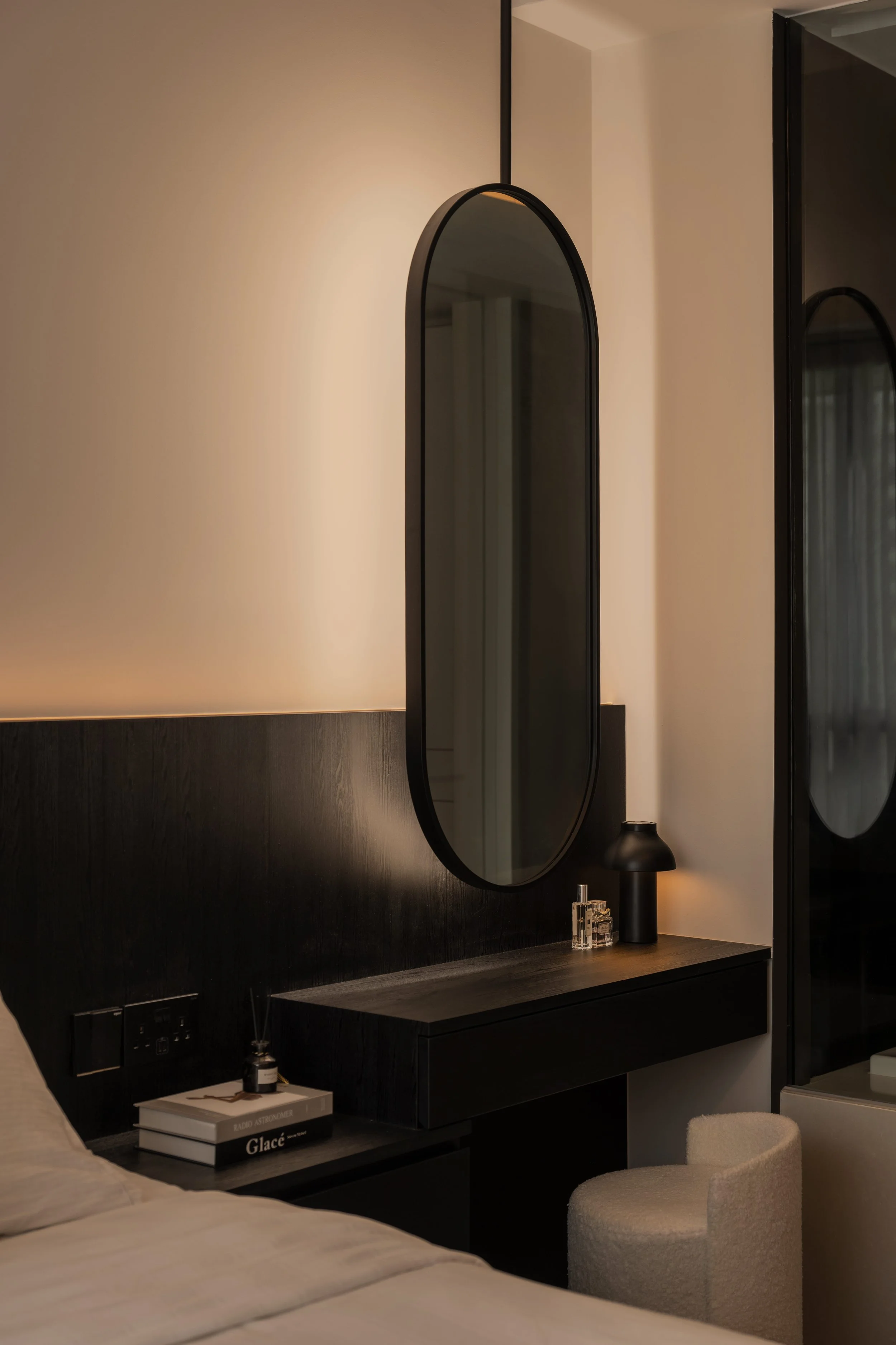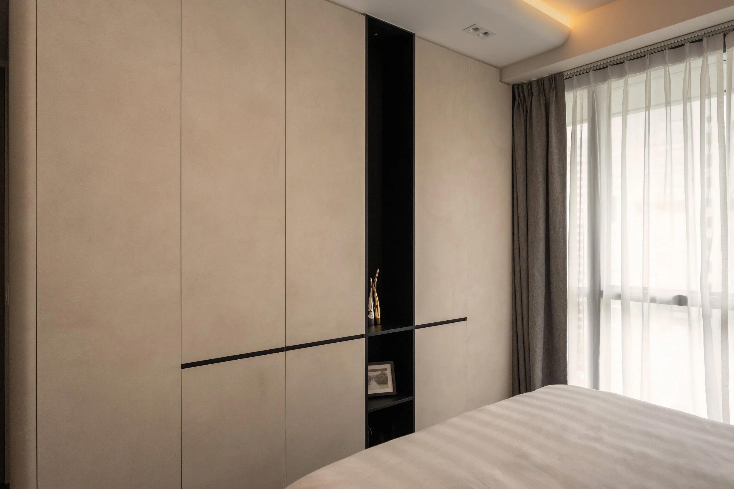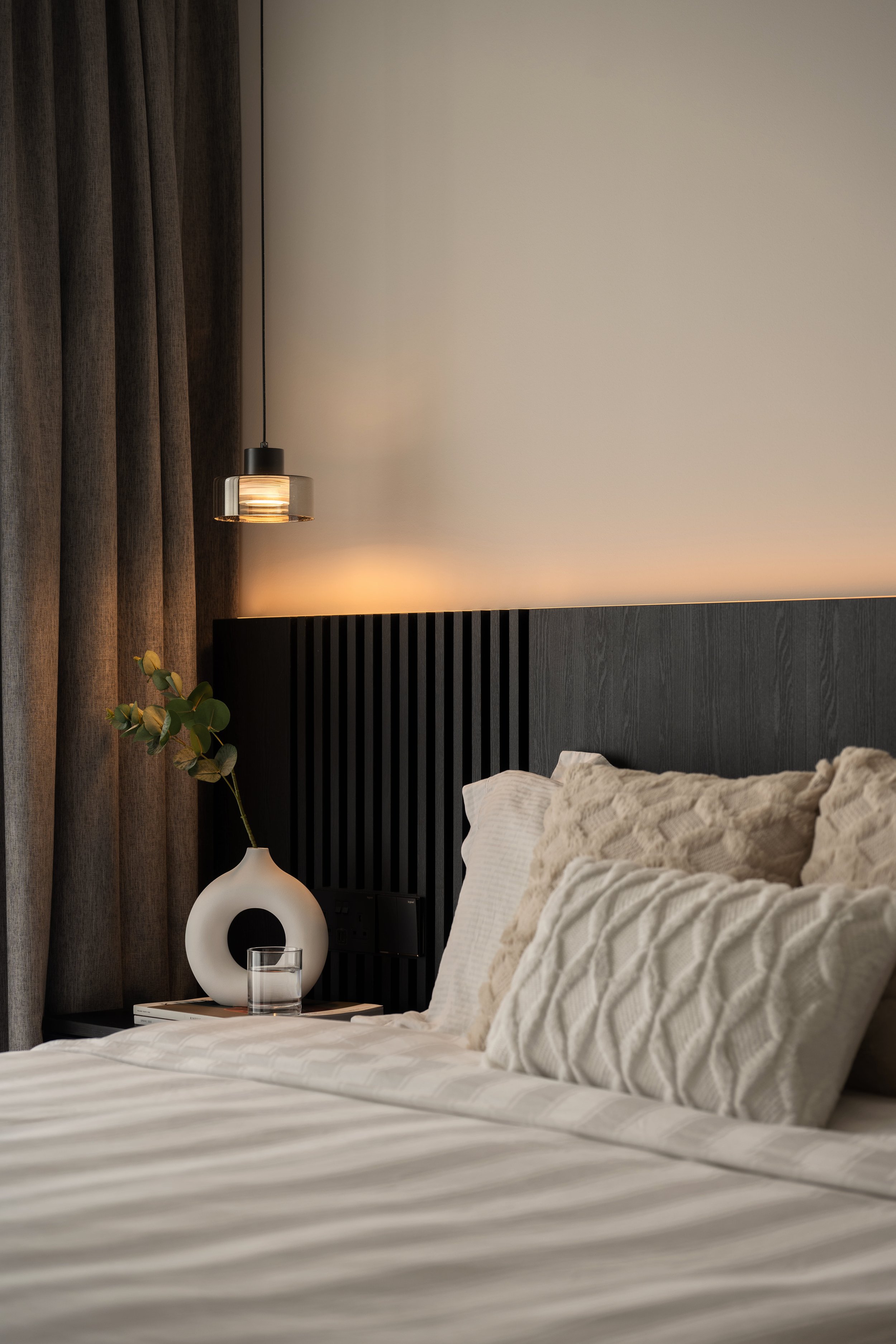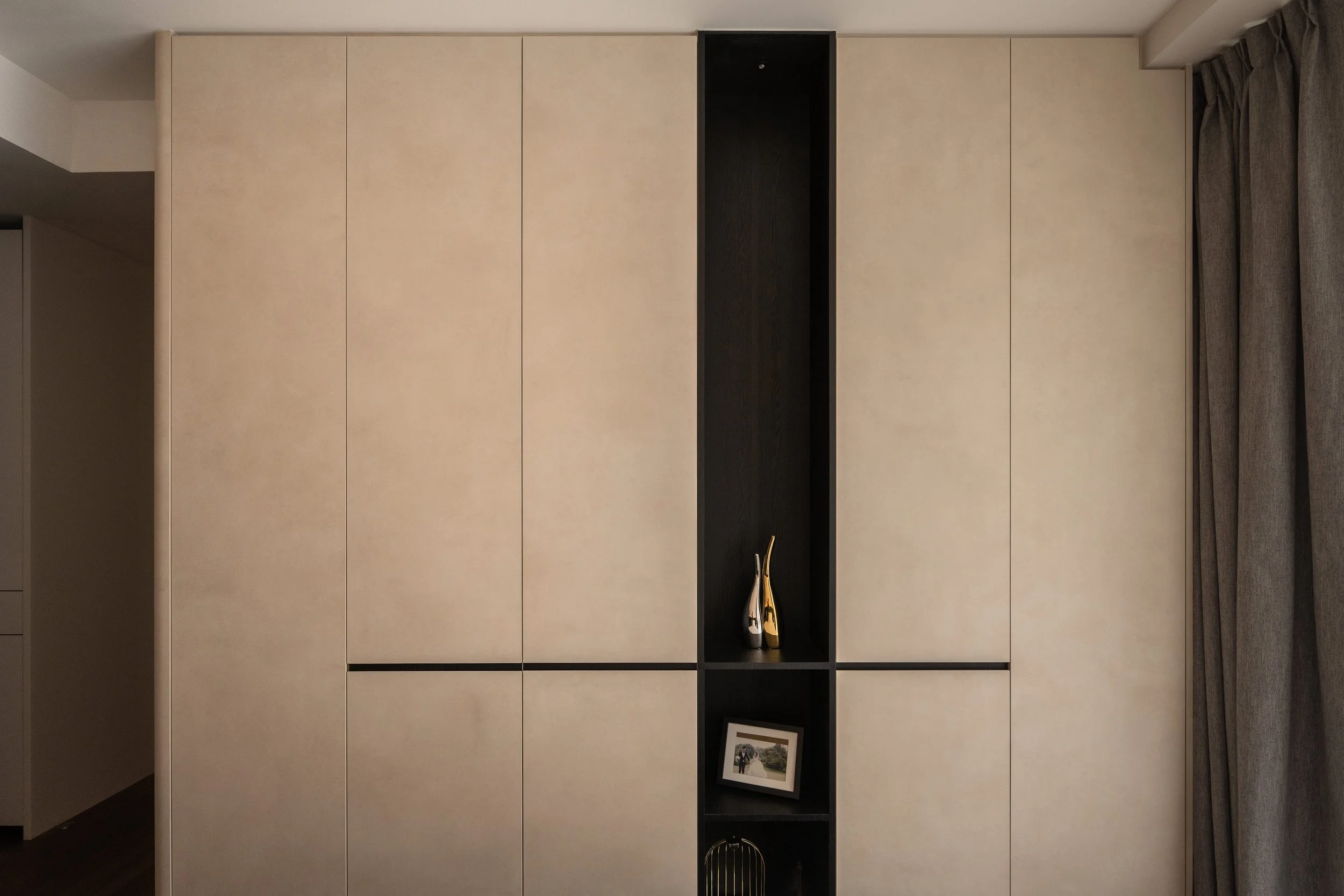 This residence is a masterclass in harmonising contrasts. Expansive windows invite streams of natural light, softened by sheer drapery, into spaces where deep, moody tones create an intimate backdrop. In the study, a long, sleek desk shares the stage with a polished Yamaha piano, embodying both productivity and creativity. Gentle accent lighting along display shelves draws the eye to curated decorative fittings, while the living area extends this narrative with a seamless interplay of dark wood, marble, and concealed illumination.